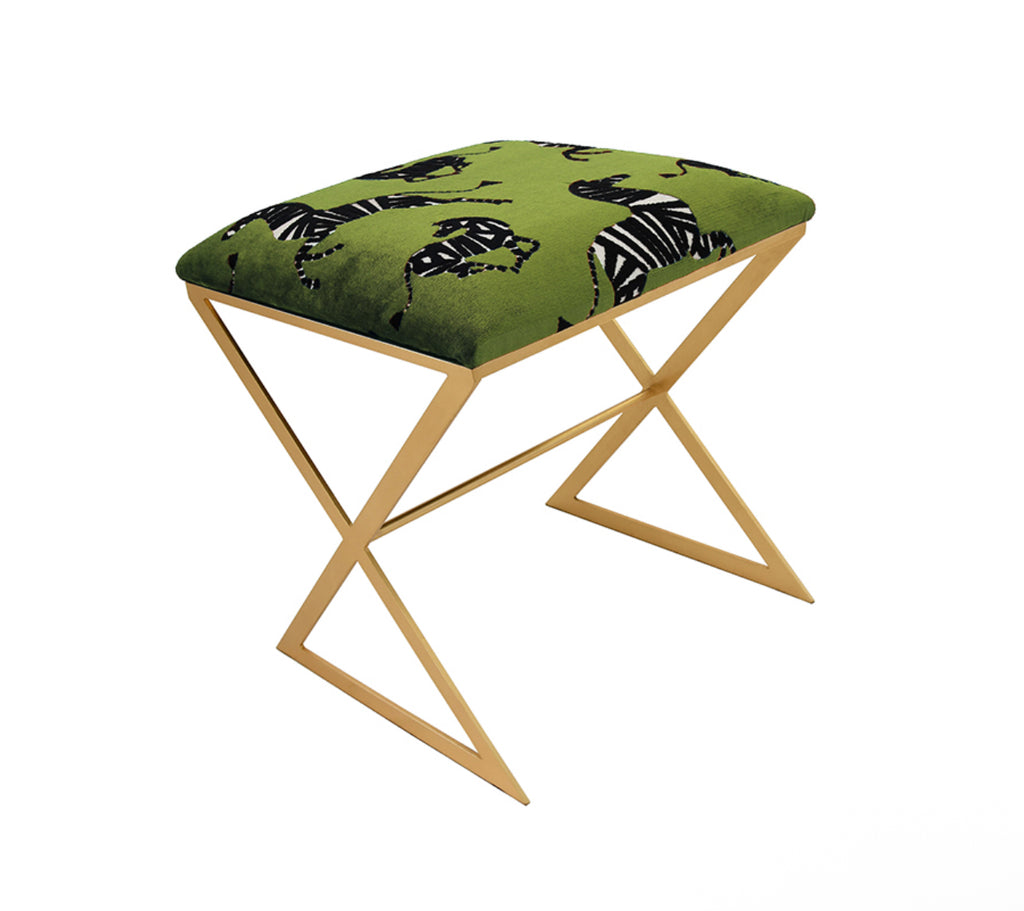 X marks the spot for style! The X Side stool, with its gold frame and cushion in luxe green colored zebra upholstery is a treasure waiting to be discovered. From occasional seating stored neatly under your console or a permanent seat at the table, you'll find this little gem has many applications making it a treasured addition to any room in your home.