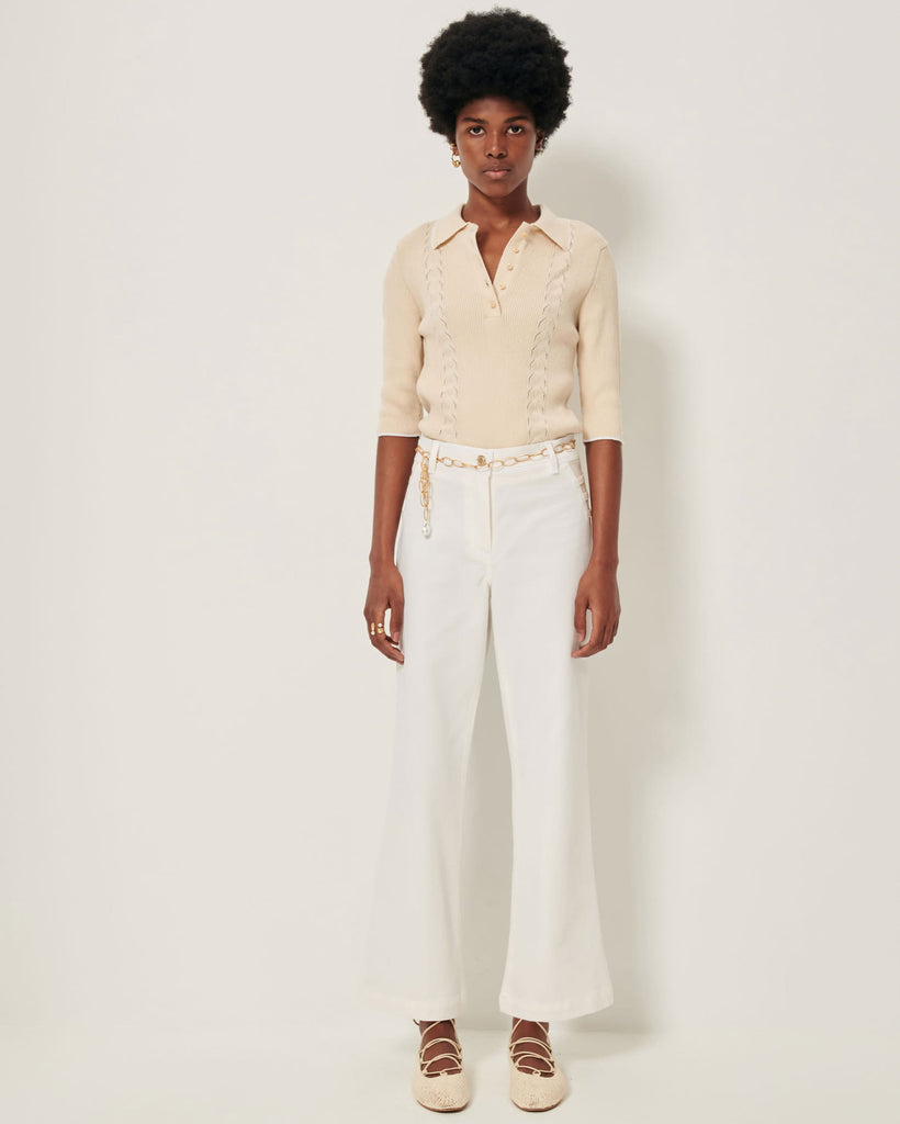 Polo shirt with ¾-length sleeves in rib knit with openwork details. Contrasting trims on the collar and sleeves.