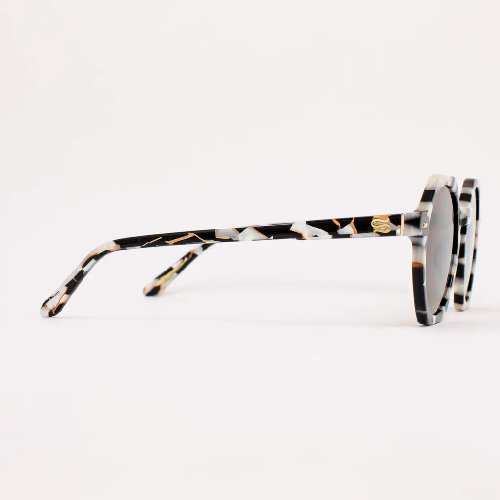 Everything you loved about our best-selling Georgie frame, scaled up with 20% more size and coverage. The Millie takes its cues from the icons of the ‘70s — oversized, soft hexagon curves, custom gold rivets, and flat lenses for a perfectly polished profile. Designed to turn heads, but light enough to forget you're wearing them. Cosmic Cowboy takes cues from rodeo glam and midnight skies—monochrome marbling meets flickers of gold for a look that feels both vintage western and completely otherworldly. Whether you're two-stepping into a wedding or happy hour-ing in worn-in jeans, this frame brings that shoot-for-the-moon confidence.