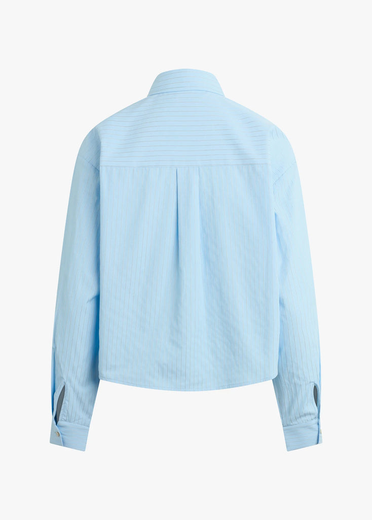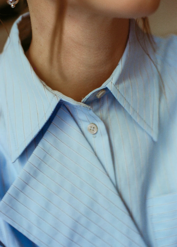 A collared shirt, reworked. The Jenni Top in Light Blue Stripe is boxy, slightly cropped, and finished with a wrapped detail that makes it feel like a favorite.